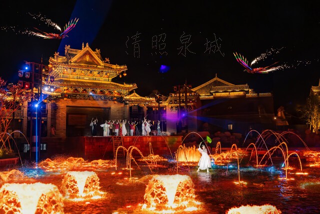 黄昏时,在古城内追一场夕阳映泉。远处的天际被晕染成橘粉色,余晖淡淡泼洒在楼阁飞檐之上,令古城平添了几分朦胧的诗意。夜晚的明水古城,檐下的灯笼一盏一盏地亮了,泛着温暖的、橘黄色的光,将墙壁染成淡橘。喜静的人偏爱小巷,光映在青石板路上,泛着微微的油亮。喜闹的人偏爱演出,若说古城之夜必看节目,那定是泉秀。当喷薄泉涌化作天然的舞台,流光溢彩的灯光与长袖曼妙的古舞交织在一起,水与光共舞,古与今辉映。